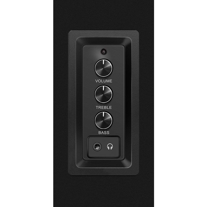 Модель оснащена разъемом для подключения проводных наушников. На боковую панель правой колонки вынесены ручки регулировки громкости и плавной настройки тембра.