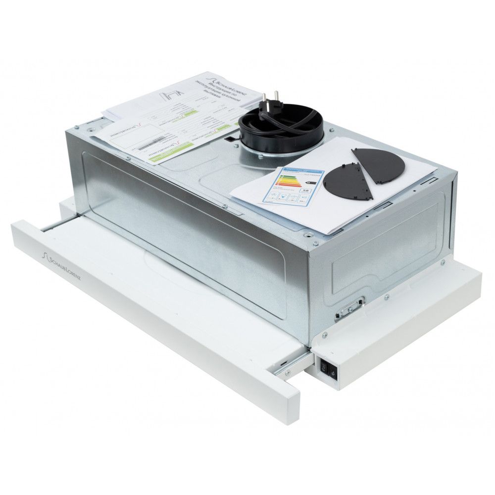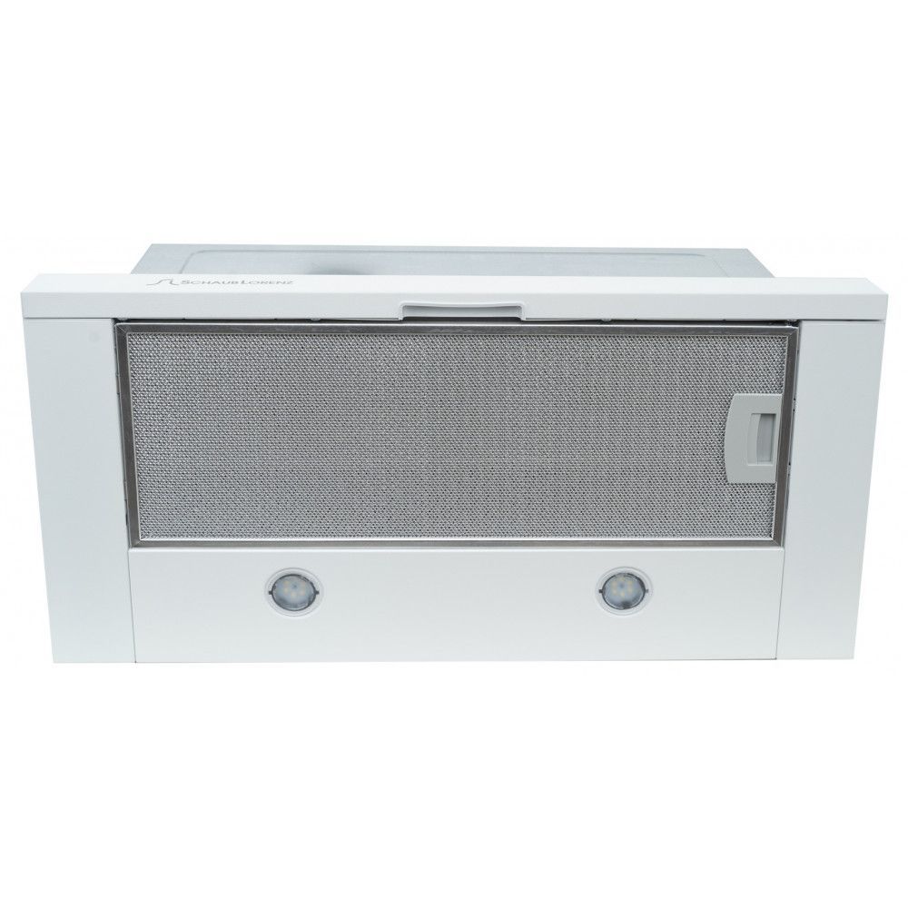Раздвижная вытяжка Schaub Lorenz SLD TW6608 белого цвета изготовлена из металла.
