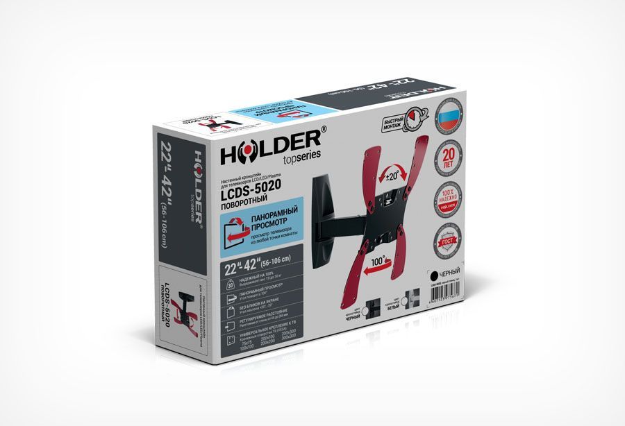 Крепление Holder LCDS-5020 изготовлено по стандартам VESA: с крепежными отверстиями от 75х75 до 300х300 мм. Кронштейн позволяет просматривать настенный телевизор под углом ±20 градусов вверх либо вниз. Закрепленный монитор или ТВ можно поворачивать под углом в 90 градусов.